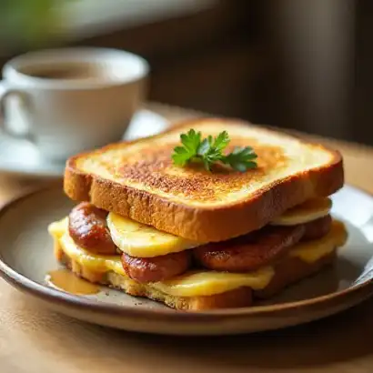 Este sándwich combina la dulzura natural del plátano con el sabor salado de la salchicha, creando un contraste especial. Con capas de texturas y muy saciante, es perfecto para las mañanas ajetreadas cuando necesitas energía rápida.