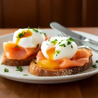 Este clásico del brunch combina huevos escalfados, salsa holandesa y salmón; la salsa cubre el pan suave y ofrece una experiencia lujosa. Ideal para mimarte el fin de semana.