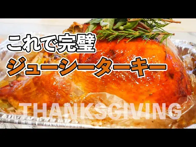 焼き時間はターキーの大きさによって調整してください。内部温度が74℃(165°F)に達しているか確認してください。📌