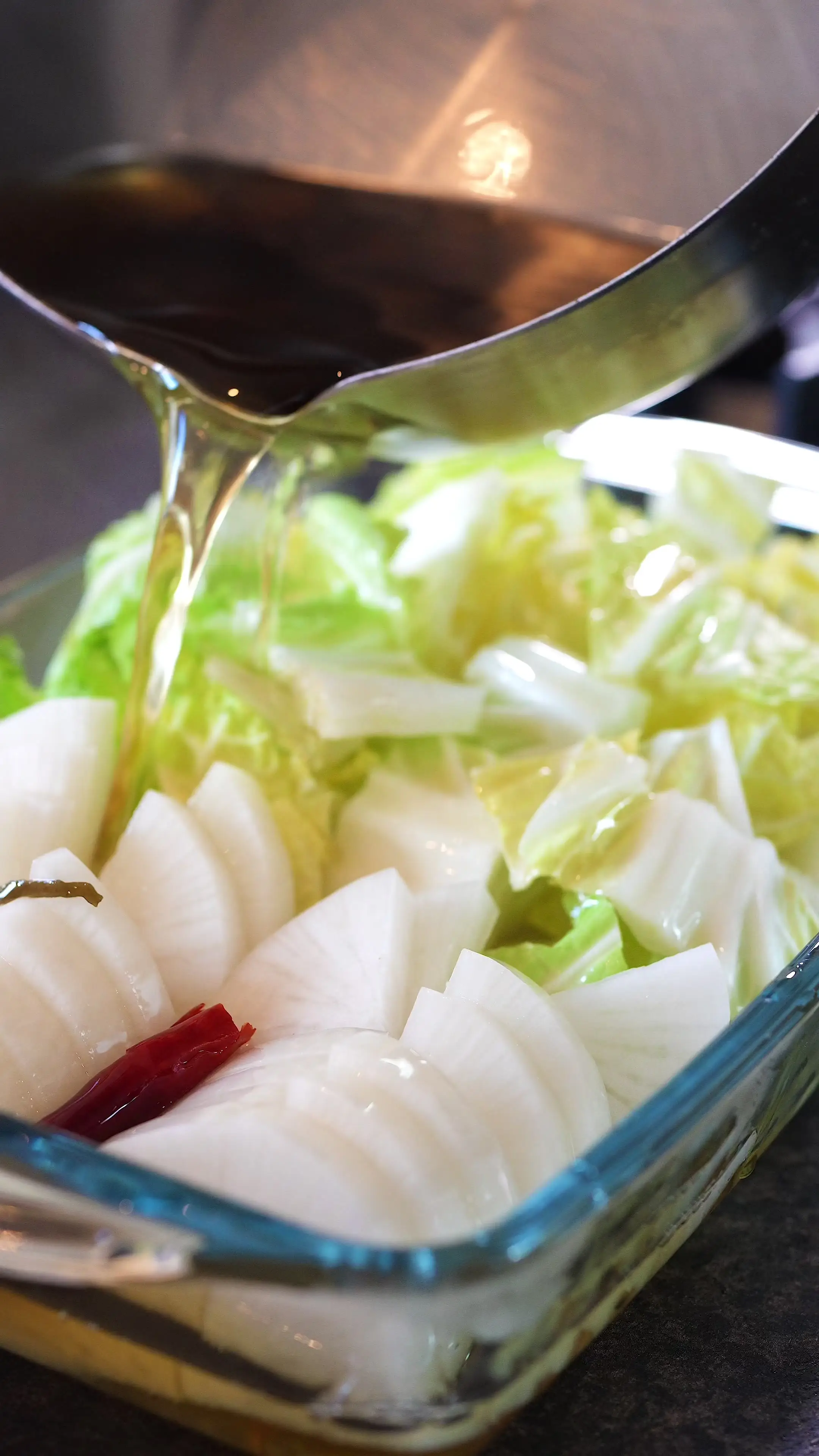 保存容器に切った白菜と大根を入れ、粗熱を取ったたれを注ぎます。野菜全体がたれに浸かるように軽く押さえ、冷蔵庫で30分以上漬け込んだら完成です。