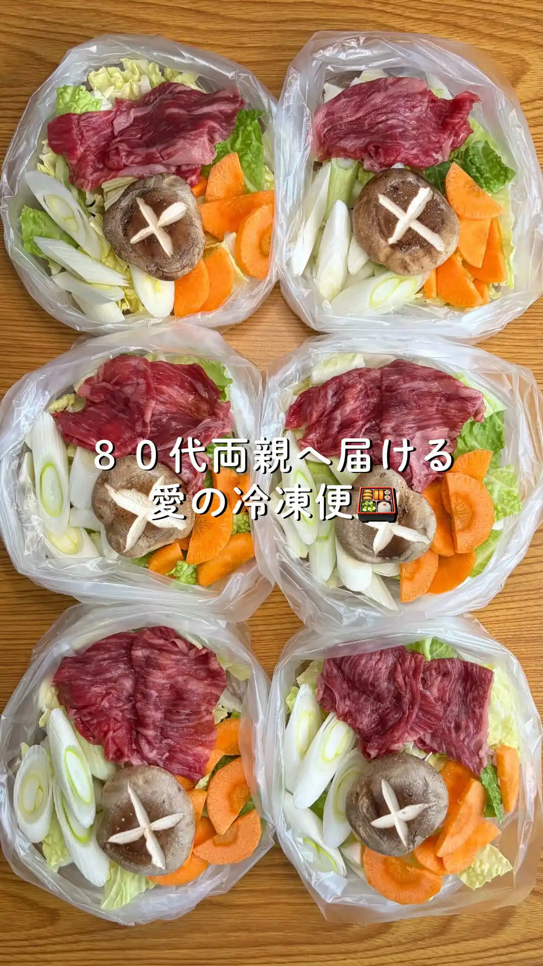 すき焼き用牛肉、準備した白菜、長ねぎ、にんじん、しいたけ、焼き豆腐、しらたきをそれぞれ1食分ずつに分け、フリーザーバッグに入れます。