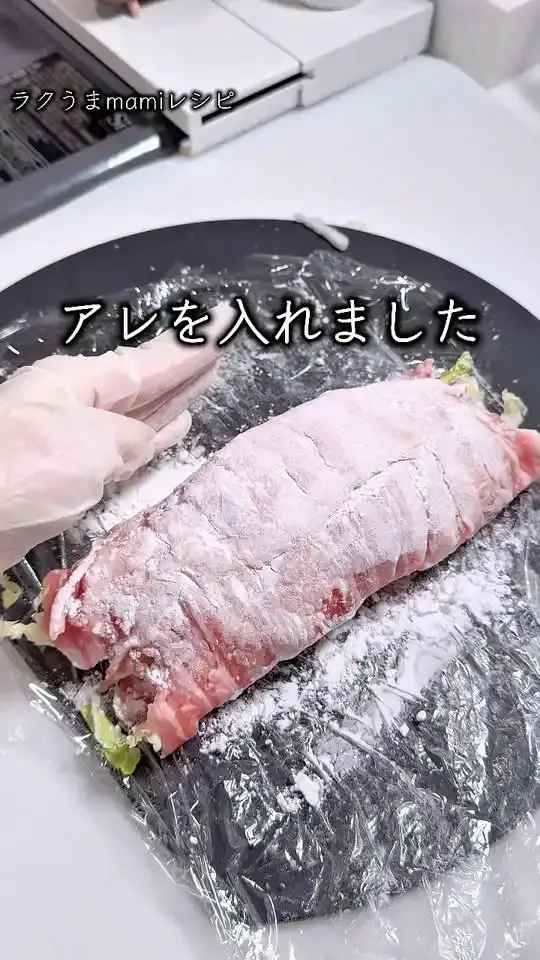 豚バラ薄切り肉を広げ、白菜の葉と芯を乗せて端からしっかりと巻く。これを必要な個数分作る。