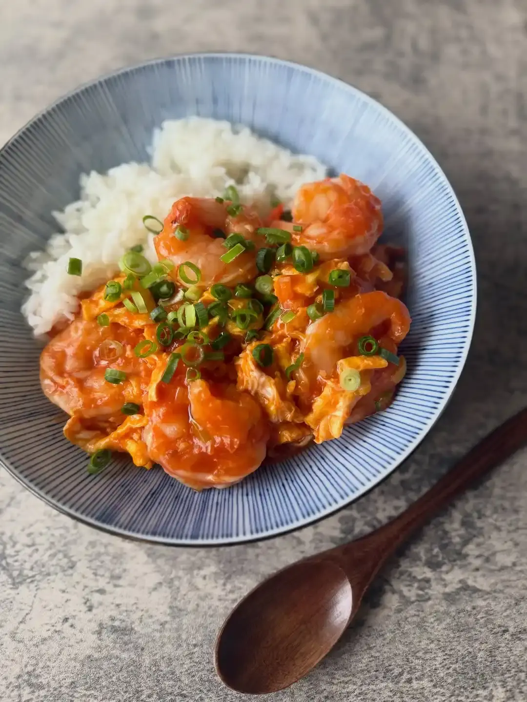 ごはんにエビチリを盛り付け、お好みで小ねぎを散らして完成です。