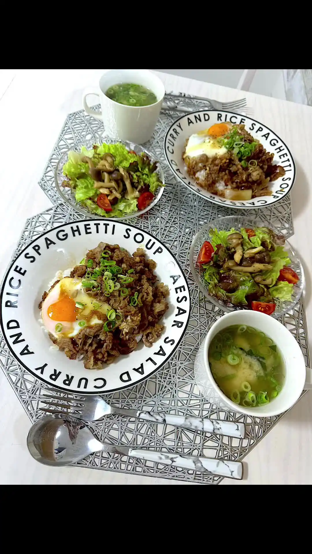 温かいご飯2膳分を丼に盛り、すき焼き風に仕上げた牛肉と玉ねぎを乗せます。目玉焼きを添え、小口切りにした長ネギ適量を散らして完成です。味噌汁にも小口切りねぎ適量を散らして、きのこサラダと共に提供します。