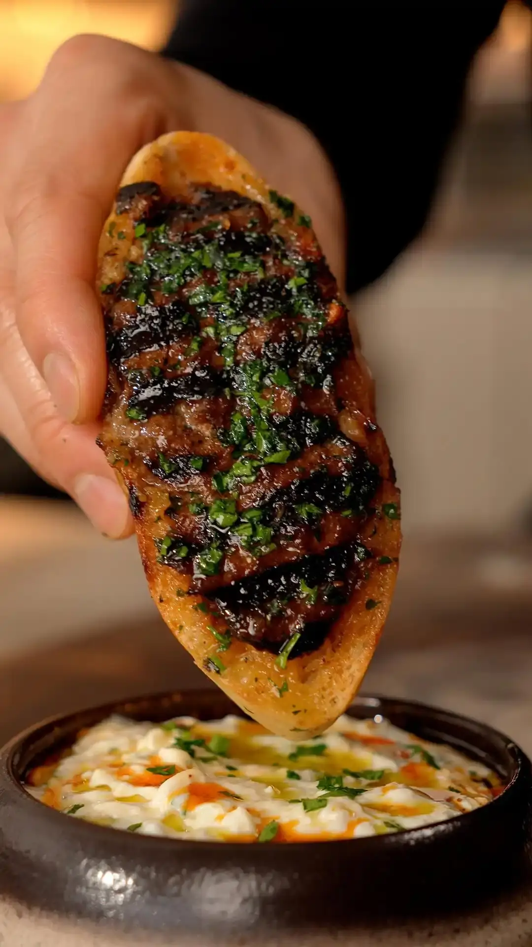 皿にガーリックソースを盛り、仕上げにオリーブオイル、チリオイル、ごま、追加のパセリを散らして完成です。