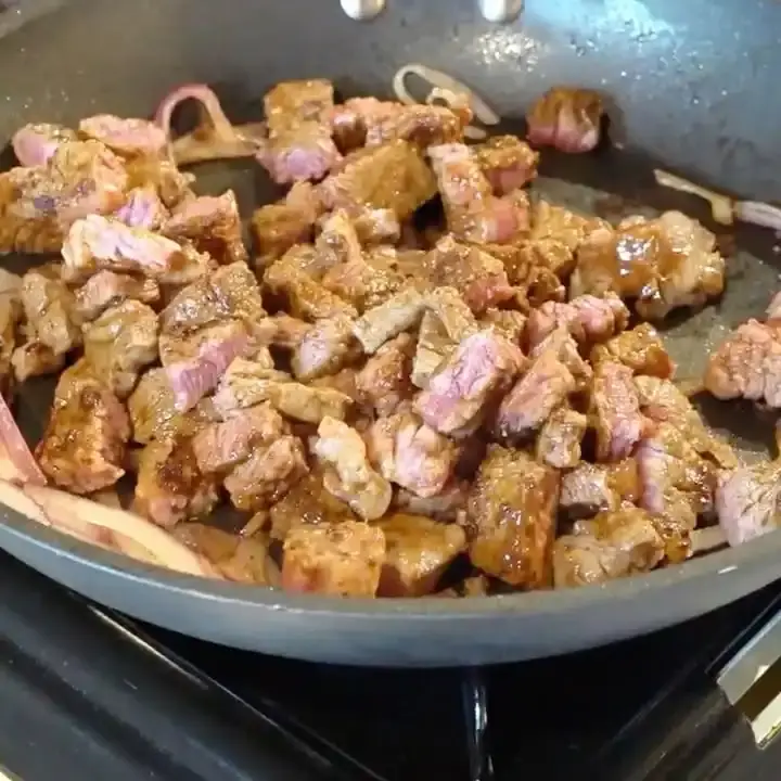 フライパンを中強火で熱し、マリネした牛ステーキ肉と薄切りにした赤玉ねぎを加えます。牛肉に焼き色がつき、好みの火加減になるまで炒め、赤玉ねぎがしんなりするまで炒めます。