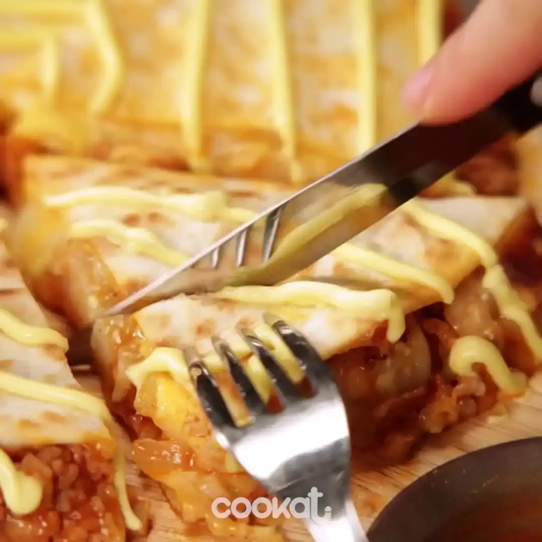 チーズの上に焼いたエビをのせ、ソースをかけたら半分に折り、適当な大きさに切ります。