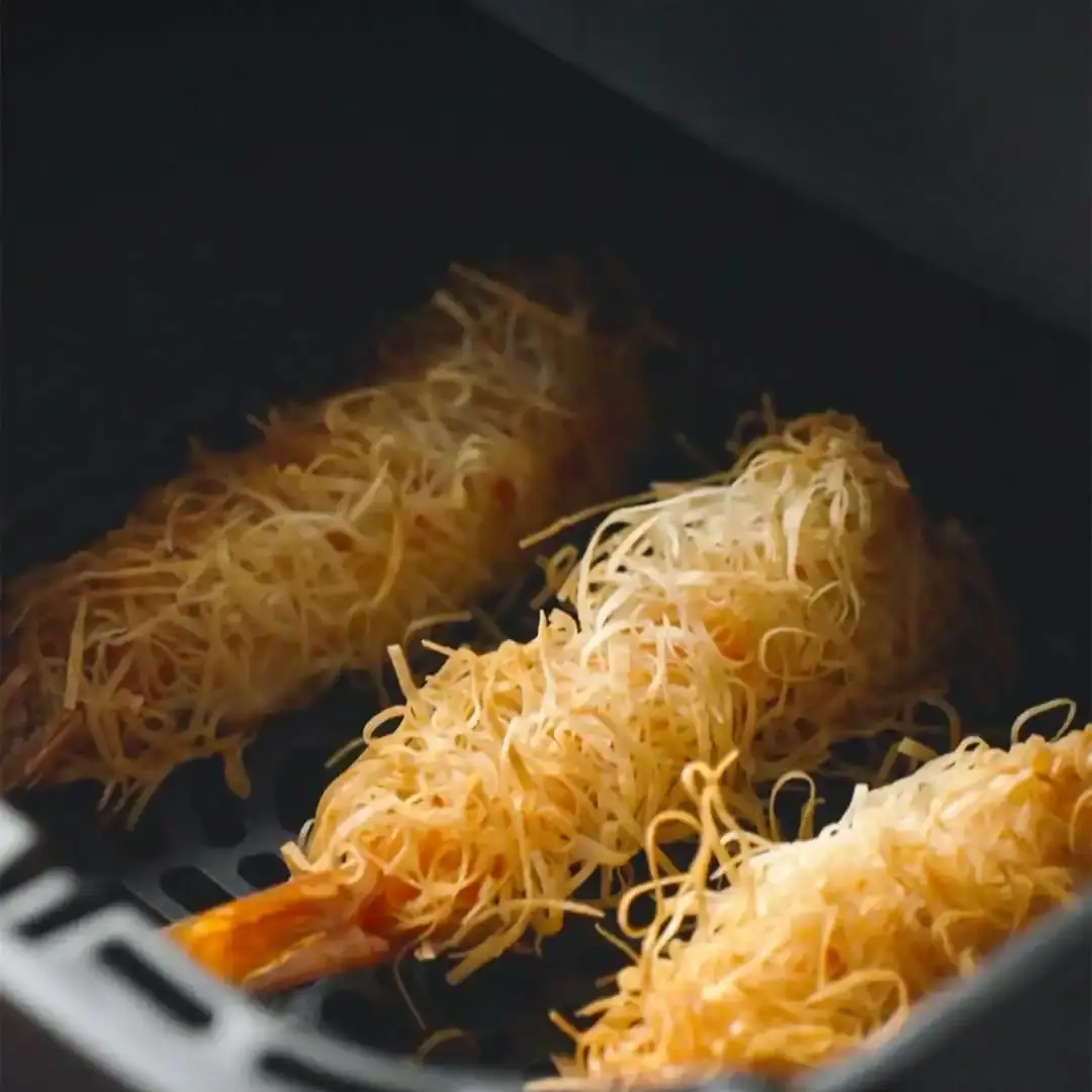 COSORI TurboBlaze™ 6.0L ノンフライヤーのバスケットに作ったエビパリフライを並べ、ノンフライモードで175度に設定し、15分間加熱を開始します。