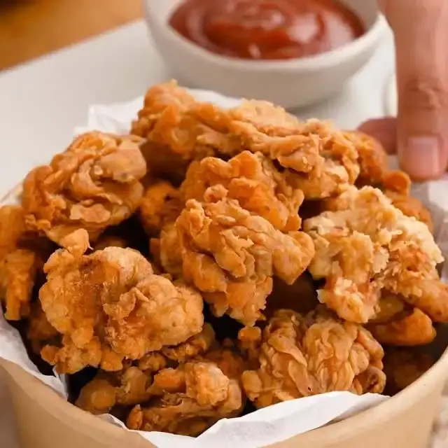 揚げた鶏肉は、余分な油を切るためにペーパータオルを敷いた皿に移します。温かいうちにケチャップや他の好きなディップソースを添えて提供します。