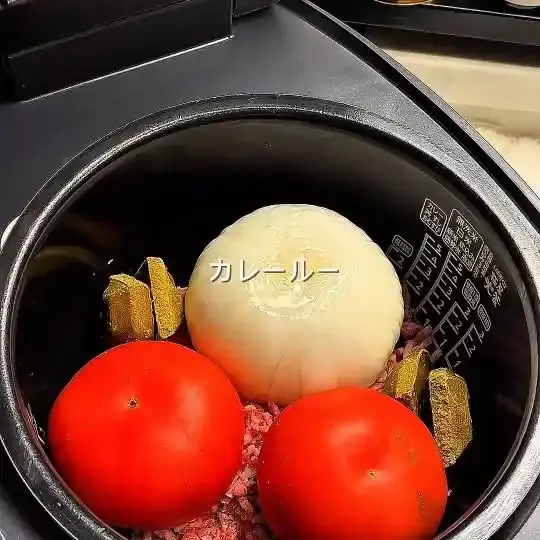 炊飯器の内釜に牛ひき肉、皮をむいた玉ねぎ、ヘタを取ったトマト、そして水を入れます。
