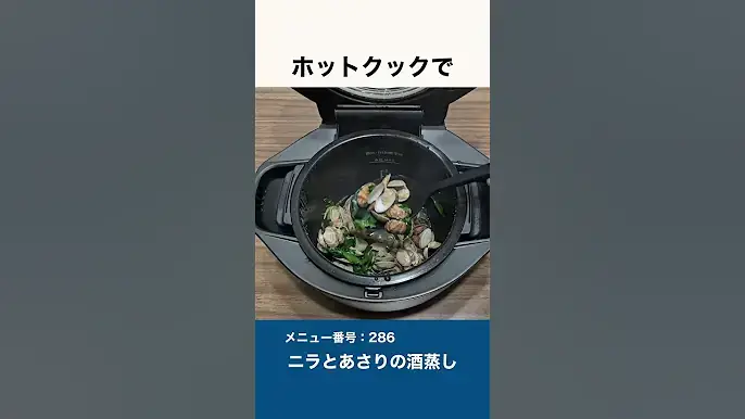 ホットクックのメニューから「ニラとあさりの酒蒸し」を選択し、調理を開始します。または、手動で蒸し料理を設定し、約13分間加熱します。