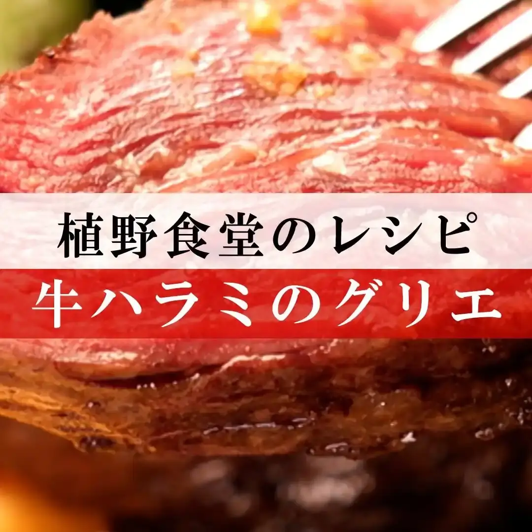強火に熱したグリル板に牛ハラミをのせ、浮いている部分を押さえながら十文字にきれいな焼き目をつけます。