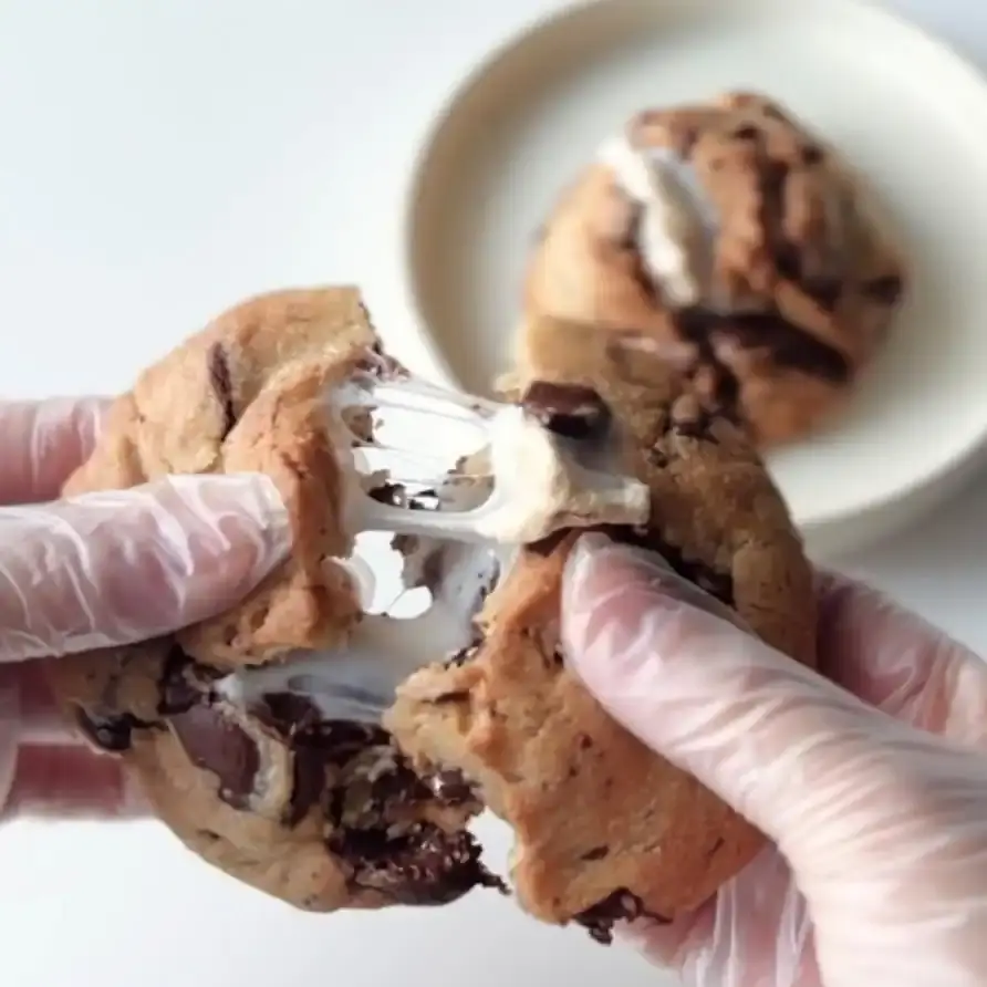 焼きたてのとろ〜りとしたマシュマロとチョコレートの組み合わせが最高です。ぜひ温かいうちにお召し上がりください。チョコレートは、お好みに合わせてミルクチョコレートやホワイトチョコレートに変更しても美味しく作れます。生地を冷凍することで、焼き崩れを防ぎ、外はサクッと、中はしっとりとした食感に仕上がります。マシュマロは中心にしっかり包み込むことで、焼いている間に溶け出して焦げるのを防ぎます。
