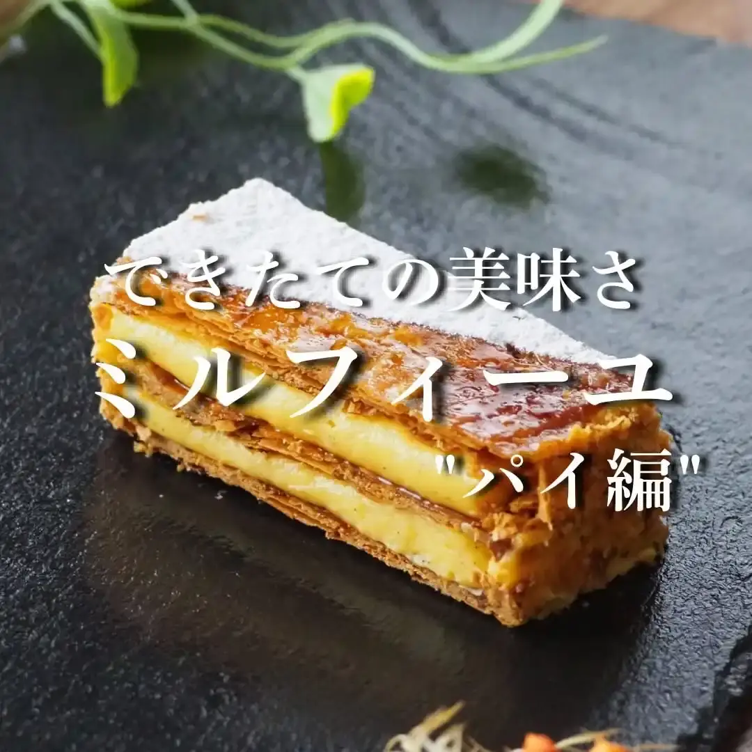 冷凍パイシートを使うことで、手間をかけずに本格的なミルフィーユが作れます。出来立てのミルフィーユは、パイ生地のサクサク感とカスタードクリームのなめらかさが格別です。ぜひ、フレッシュな美味しさを味わってください。グラニュー糖をまぶして焼くことで、パイ生地に香ばしさとキャラメリゼの食感が加わり、美味しさがアップします。パイ生地を潰す工程では熱い蒸気が出るので、火傷には十分注意してください。粉砂糖をまぶした後の焼き上げは焦げ付きやすいので、オーブンから目を離さず、焼き色を見ながら調整しましょう。ミルフィーユのカットには波刃包丁を使用すると、パイ生地が崩れにくく、きれいに切り分けられます。余ったパイ生地は細かく砕いてヨーグルトに入れたり、アイスクリームのトッピングにするのもおすすめです。組み立てる際、側面に砕いたパイをまぶすと、見た目が華やかになり、プロのような仕上がりになります。