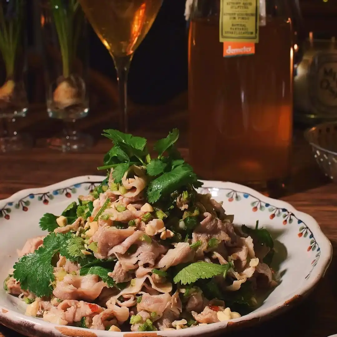 食べる直前に、パクチーの葉を加えて混ぜ、皿に盛り付けます。最後に砕いたピーナッツを全体に散らして完成です。