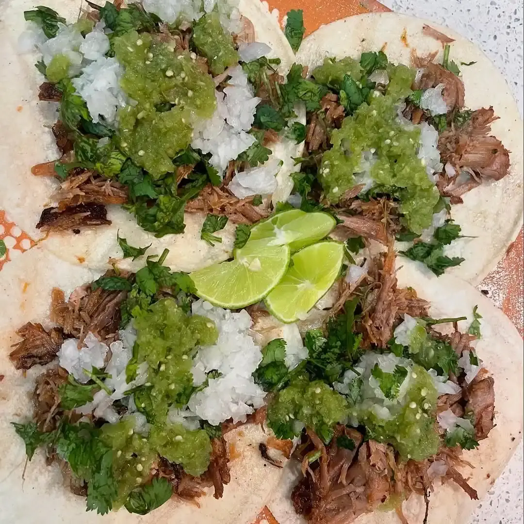 調理したカルニタスをほぐし、温めたトルティーヤに乗せます。お好みでみじん切りにしたコリアンダー、白玉ねぎ、ライムのくし切り、サルサベルデを添えてお召し上がりください。