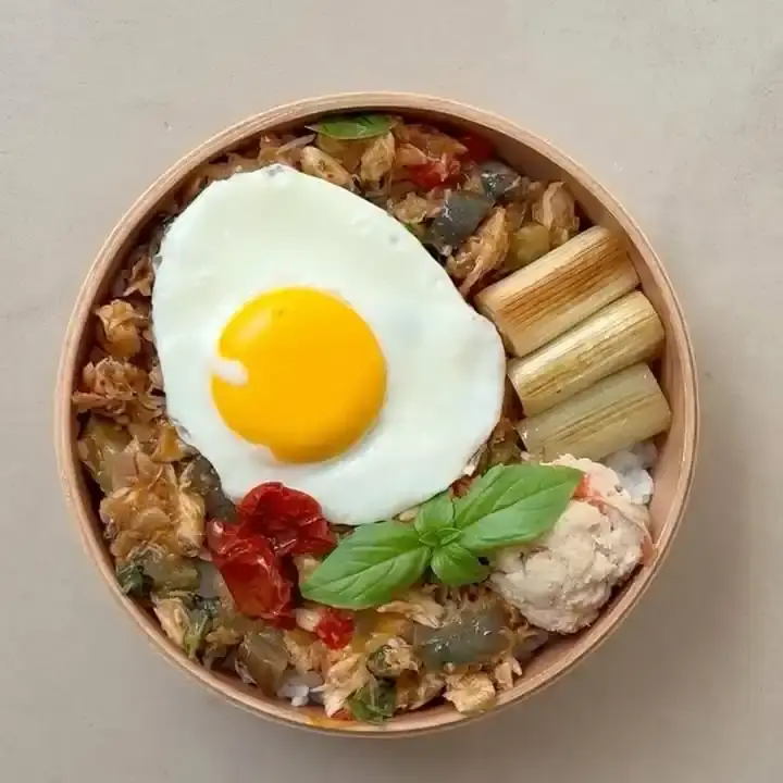 お弁当箱にご飯を詰め、鯖ガパオを乗せます。焼きねぎのマリネ、目玉焼き、ドライミニトマト、そしてフレッシュなバジルを添えて完成です。